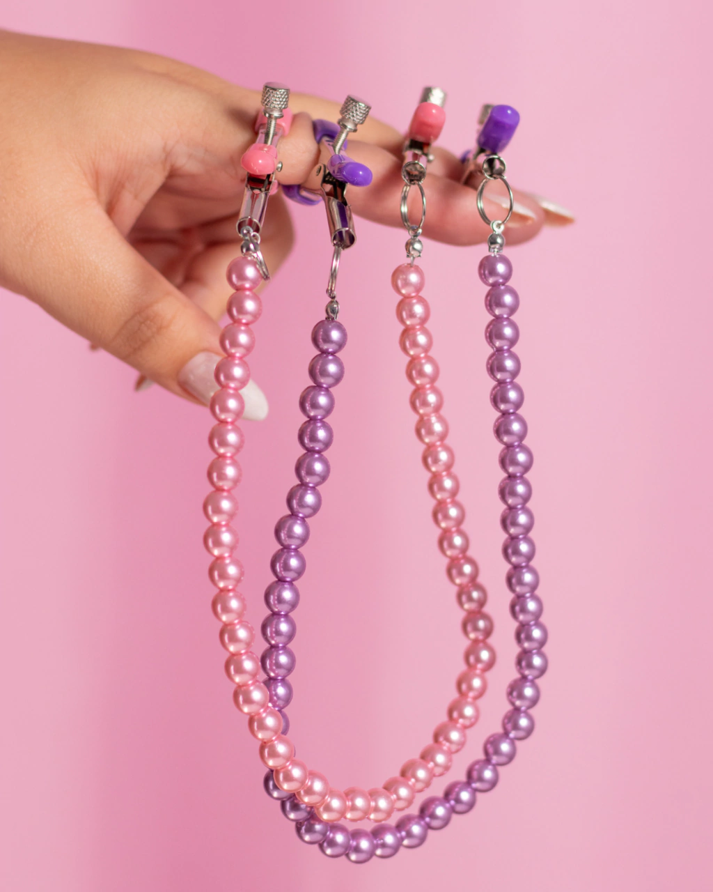 Os grampos de mamilos são lindos acessórios para quem é fã de sentir uma dorzinha e tem sensibilidade aflorada ou gostaria de ter. Com reguladores, você pode escolher o nível de pressão que será infringida no bico do seu mamilo, indo da mais leve à mais forte. Tudo isso em um colar de pérolas super lindo e elegante. Os prendedores medem 5,5 cm de comprimento, e as pérolas têm 30 cm de comprimento.